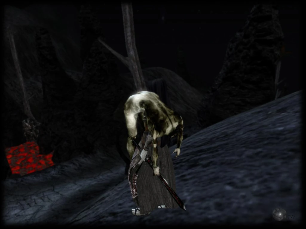 The second thing you notice is that you're losing health. It's only a bit, but it keeps happening, a little bit at a time. The longer you stay in one place, the quicker it seems to occur. If you let this health loss kill you, you'll find the cause: a figure we came to call the Assassin, because he seems to wear a retextured version of the Dark Brotherhood armor from Tribunal, even though the expansions don't work in JVK. It's all black, completely untextured, like he's just a hole in space. The way he moves... he gave me quite a start, the first time I saw him scuttling around my dead body. He crawls inhumanly on his hands and feet, his arms and legs splayed out like a spider. You'd usually only see him after death, crawling around and over your body just before the reload box popped up. Occasionally, you could catch a glimpse of him darting around a corner or crawling on a wall or ceiling. It made the game very difficult to play at night!