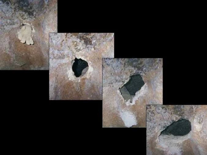The lower left-hand corner of the hole had been giving us grief because of the thickness of the wall at that point. We felt that if we could just remove that corner, we might be on our way inside. B now held in his hand the crumbled remains of the corner. Our excitement consumed us as we examined the hole. I took the hammer and pounded away at the surface of the hole. The idea was to remove the jagged edges that would take their toll on my skin. The size looked right! Now, the moment we had been working for.